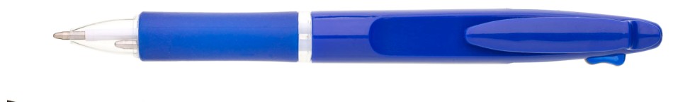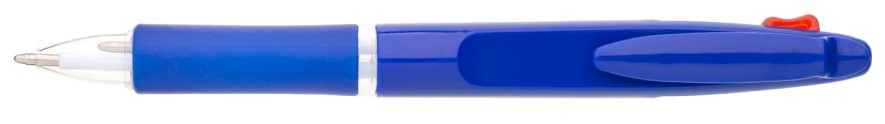 Kuličkové pero BARNA - 2 v 1, tzn.,že píše červeně a modře, vyrobeno z modrého plastu s gumovým gripem v barvě tužky.