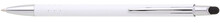 Tenká kovová propiska SOTTI s touch koncem v bílé barvě s chromovými doplňky a třemi tenkými proužky. Náplň X-20, modře píšící.