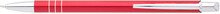 Tenká kovová propiska SOTTI v červené barvě s chromovými doplňky a třemi tenkými proužky. Náplň X-20, modře píšící.