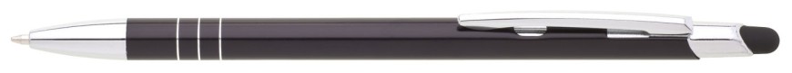 Tenká kovová propiska SOTTI s touch koncem v černé barvě s chromovými doplňky a třemi tenkými proužky. Náplň X-20, modře píšící.