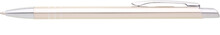 Tenká kovová propiska SOTTI ve zlaté barvě s chromovými doplňky a třemi tenkými proužky. Náplň X-20, modře píšící.