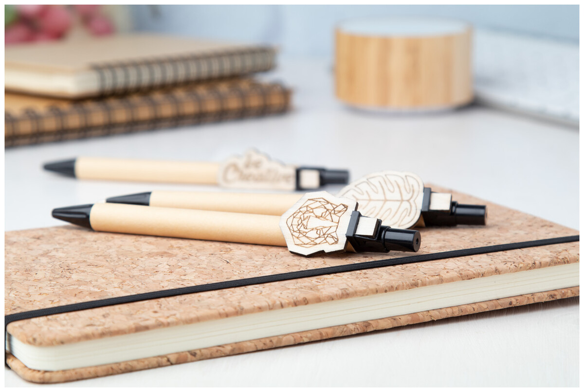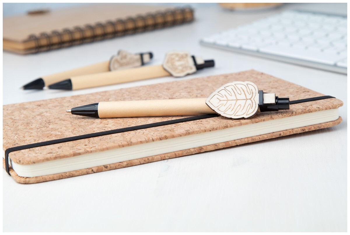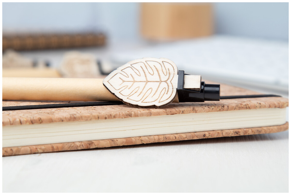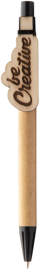 Recyklované papírové kuličkové pero s překližkovým klipem vyrobeným na zakázku a modrou náplní. Klip je vyroben na zakázku - maximální rozměr: 25×35 mm. Cena včetně gravírování loga na klip, nezahrnuje tiskovou přípravu. Min. mn.: 100 ks.