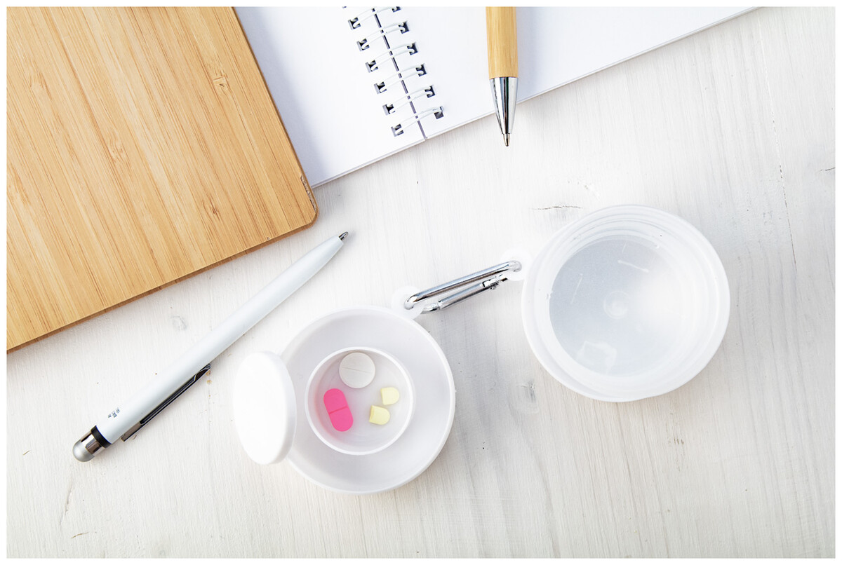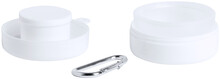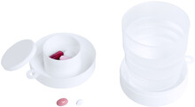 Plastový skládací pohárek s boxem na pilulky. Pouzdro s karabinkou, 220 ml.