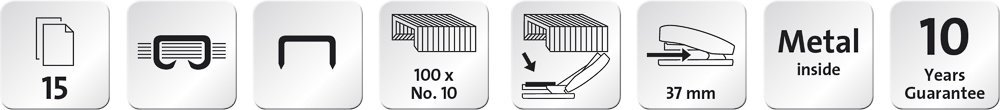 Drobná sešívačka ideální pro použití na cestách. Celokovová sešívačka s částečným horním plastovým krytem. Integrovaný odstraňovač sponek z kovu. Plnění shora s jednoduchým vedením sponek. Max. hloubka vkládání papíru 37 mm. Kapacita: 100 kusů sponek No. 10. Hmotnost: 86 g. Balení vč. 200 sponek č. 10 SUPER.