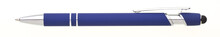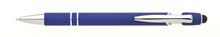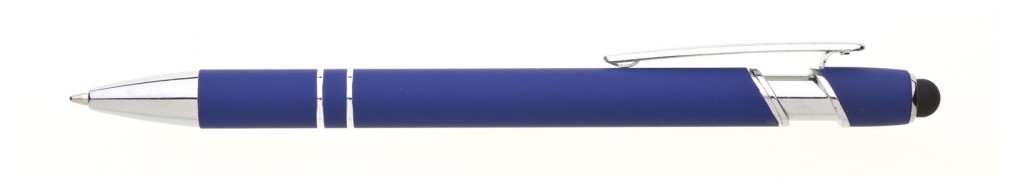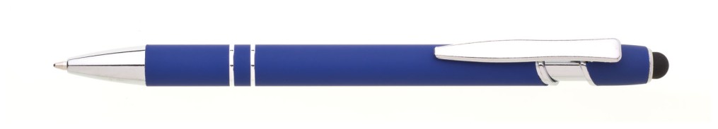 Propiska s touch koncem, měkkým pogumovaným povrchem soft v modré barvě a stříbrnými doplňky včetně dvou ozdobných kroužků. (NATIO)