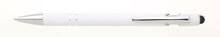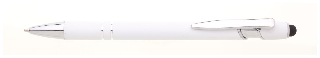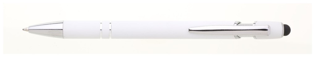 Propiska s touch koncem, měkkým pogumovaným soft povrchem v bílé barvě a stříbrnými doplňky včetně dvou ozdobných kroužků. (NATIO)