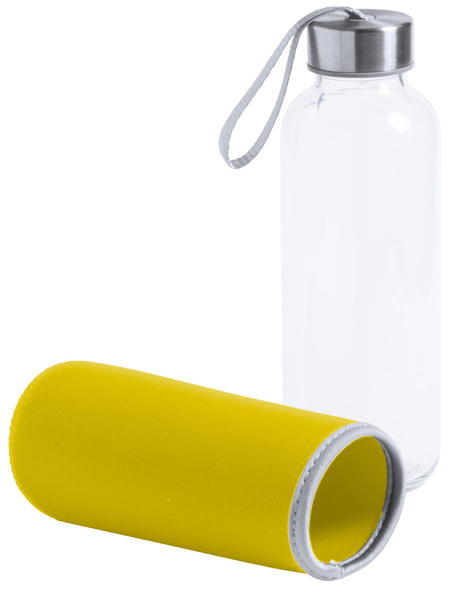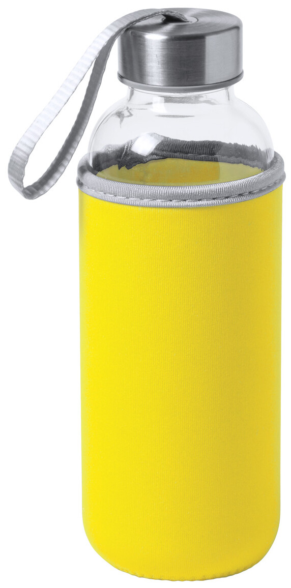 Skleněná láhev s popruhem na uzávěru a barevným neoprenovým krytem. 420 ml. Nevhodné pro sycené nápoje.