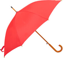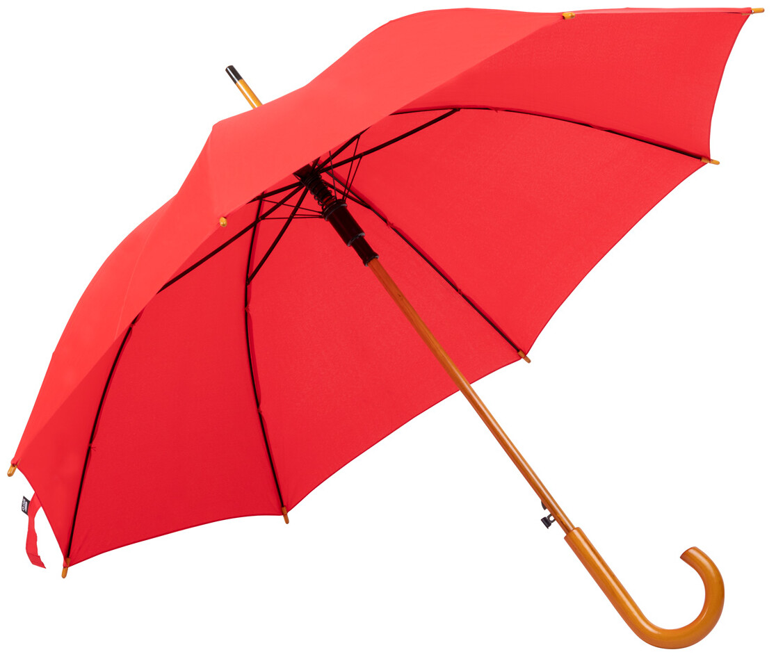 Automatický deštník s 8 panely, kovovým rámem, dřevěnou tyčkou a rukojetí. 190T RPET pongee, s etiketou s označením RPET.
