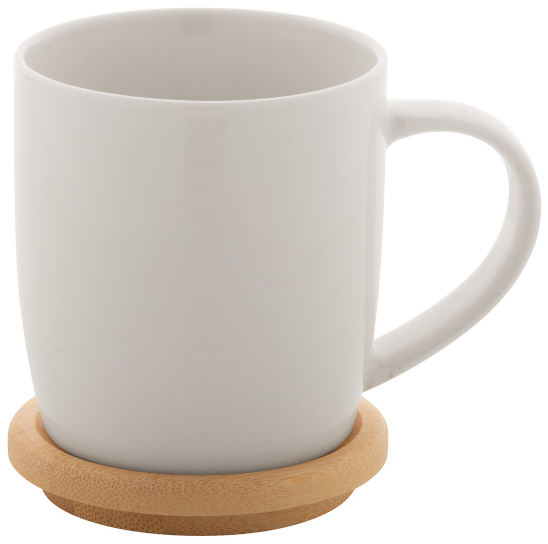 Vysoce kvalitní porcelánový hrnek v bílé barvě s bambusovým podtáckem, 320 ml. V dárkové krabičce.